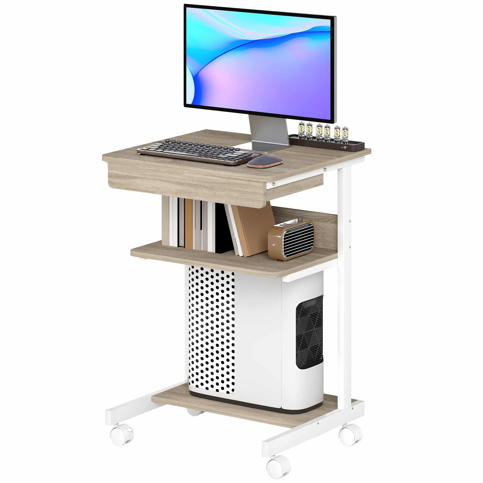 Computerbord på hjul De drejelige hjul og låsbare forhjul sikrer stabilitet, mens en rummelig skuffe og to hylder holder dit arbejdsområde organiseret. Den moderne elegance fra trælignende overflade og slanke metalramme gør det ideelt til familier, der væ
